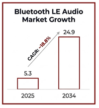 - Bluetooth LE Audio with LC3 codec drives a $24.9B market shift by 2034.