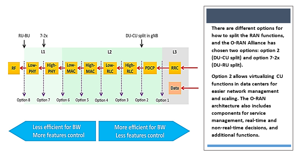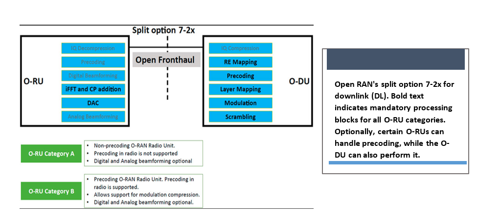 Additionally, the O-RAN Alliance distinguishes the 7-2x split between Category A and Category B type O-RUs, depending on whether they support the precoding function. The Category B type O-RU supports multi-antenna systems for massive MIMO, while Category A O-RU supports RRHs with different Tx/Rx configurations. The O-RAN Alliance also introduces a new concept: split RICs based on latency. Non-RT RIC handles slower tasks like fault management, while near-RT RIC handles faster jobs like radio resource allocation. This division allows for complex AI/ML tasks to be performed in central locations and then executed in real-time, improving efficiency and compatibility with legacy systems.