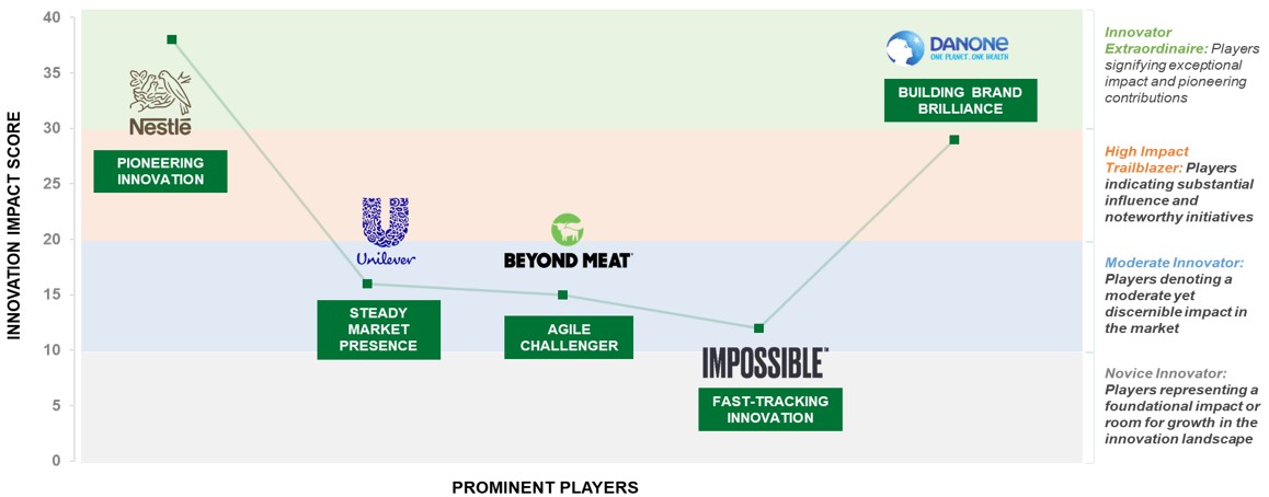 In summary, the graphical representation above serves as an insightful conclusion to our exploration of the plant-based food industry's key players. The Innovation Impact Score, meticulously calculated for each prominent brand, provides a visual snapshot of the industry dynamics. This score intricately analyzes essential market parameters, encompassing collaborations, acquisitions, joint ventures, investments, product launches, business expansion, and initiatives in research, development, and health. Through this visual representation, we gain a comprehensive understanding of how these strategic maneuvers collectively shape and amplify each player's innovative impact within the thriving plant-based industry.