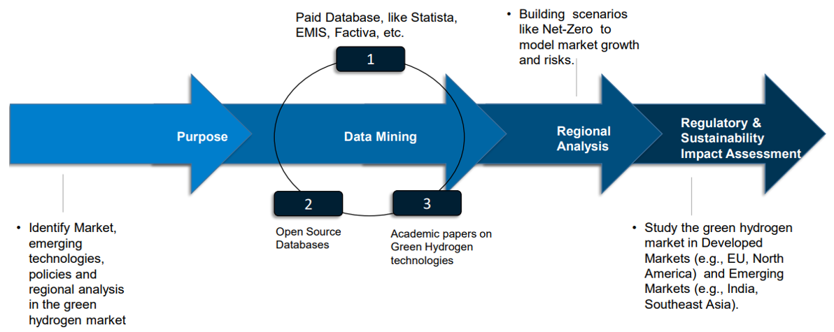 We use a thorough and data-driven approach to deliver accurate, reliable, and practical insights into the green hydrogen market. By combining information from trusted sources like Statista and EMIS with open-source data and academic research, we ensure that our analysis is both detailed and precise. Our research process includes extensive data mining and verification, where we cross-check facts from government reports, industry associations, and patent databases to provide credible market estimates and technology trends. We also conduct regional and scenario analysis, forecasting hydrogen production capacity, supply-demand trends, and Net-Zero targets across major regions like Asia Pacific, Europe, and North America to identify future growth opportunities.Additionally, we assess policy frameworks, ESG (Environmental, Social, and Governance) factors, and industry collaborations to help businesses understand and navigate regulatory, investment, and sustainability challenges. With strong expertise and a research-backed approach, we deliver comprehensive, forward-looking intelligence that empowers stakeholders to make informed, strategic decisions in the rapidly growing green hydrogen industry.