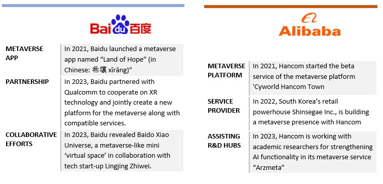 Numerous Chinese companies are actively involved in pioneering Metaverse innovations within China. For instance, Ranmai Technology introduced Ayayi, China's inaugural meta-human, in May 2021. Additionally, key industry players such as Baidu, Tencent, and Alibaba significantly contribute to China's dominance in the Metaverse realm.