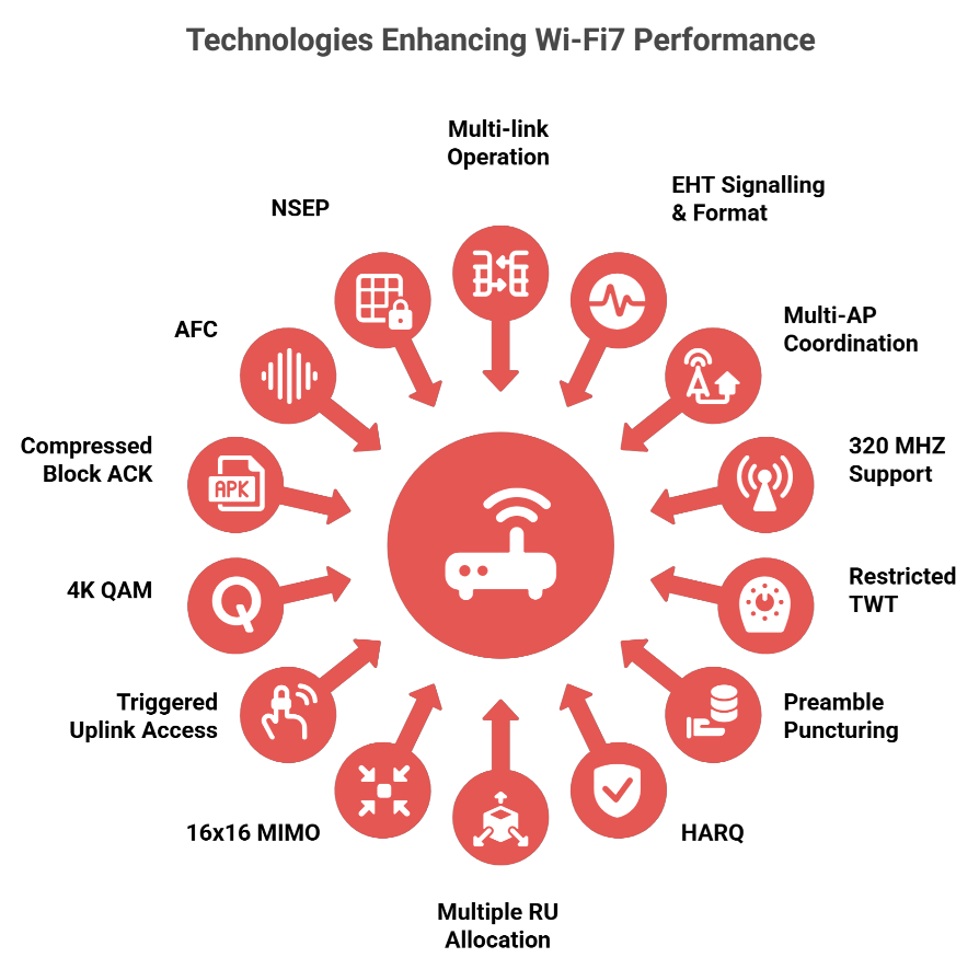 Wi-Fi 7 (IEEE 802.11be) supports both consumer and enterprise use, while introducing unprecedented enhancements to efficiency, reliability and speed. In comparison to previous standards, Wi-Fi 7 supports Multi-Link Operation (MLO), allowing devices to boost performance by simultaneously utilizing all three bands—2.4, 5, and 6 GHz. With 320 MHz channels and 4096-QAM, it delivers faster data rates—up to 46 Gbps in ideal conditions. Support for 16x16 MU-MIMO and Compressed Block Acknowledgment strengthens performance in dense environments. Features such as Multi-AP Coordination, HARQ, and Preamble Puncturing enhance roaming capabilities and stability. Efficiency and battery life are optimized through Triggered Uplink Access, Target Wake Time, and Automated Frequency Coordination. Additionally, network slicing enables tailored wireless services for healthcare, smart cities, and industry-specific applications. Wi-Fi 7 offers multi-use capabilities, delivering up to five times the speed of Wi-Fi 6 with ultra-low latency.